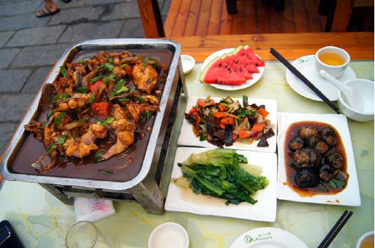 网上团购的二人餐59.00元,(田螺酿,杂菌炒肉片,油菜,剑骨啤酒鱼,一盘饭,一壶很香的花茶)两人吃不完,感觉真不错哩。