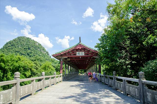 桥面有风雨长廊,桥亭覆绿色琉璃瓦,桥身为磐石,具有浓郁的民族风格。