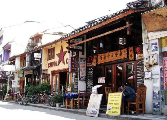 西街,此时会涌入大量游客,小街不长但酒吧一家挤一家地开,有的门口还站有招呼客人的服务人员,几乎每个门口都摆有一个价格表,各种音乐声此伏彼起,各俱特色的小店也就开在的中间互相挤着生存着。一个个旅游自助旅馆也穿插在其间;房屋是连成一片,很少能看到有一条街巷。