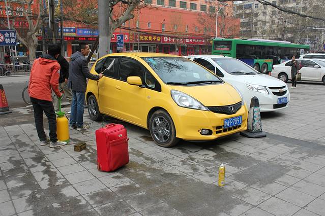 老公到大厅办理手续,一嗨工作人员在仔细清理车子。