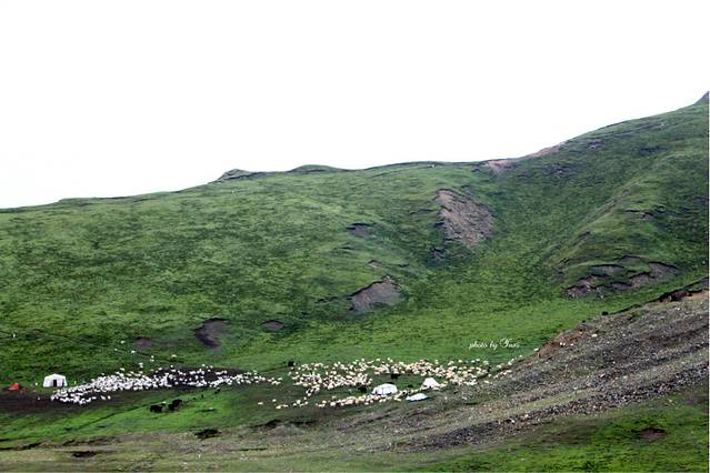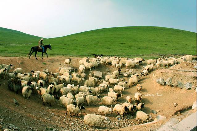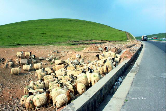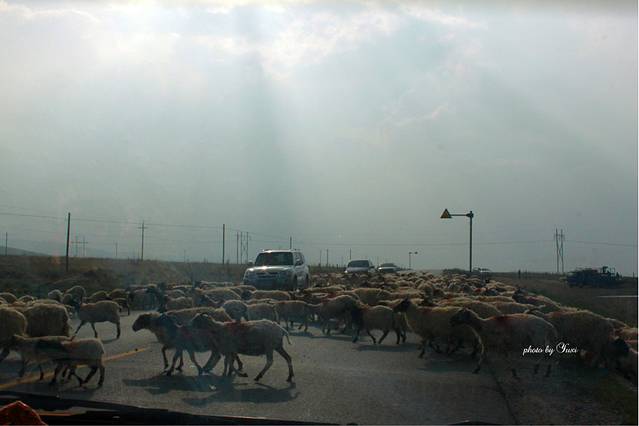 一路上看到最多的就属羊群了。仔细看这些羊身上还带着绿色,起先我以为羊群在草地上打滚沾到的,司机说这是故意涂上去的,为了容易分辨是谁家的羊。