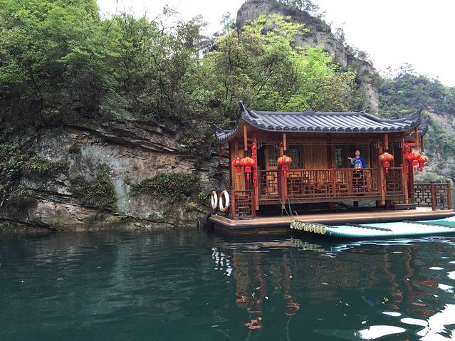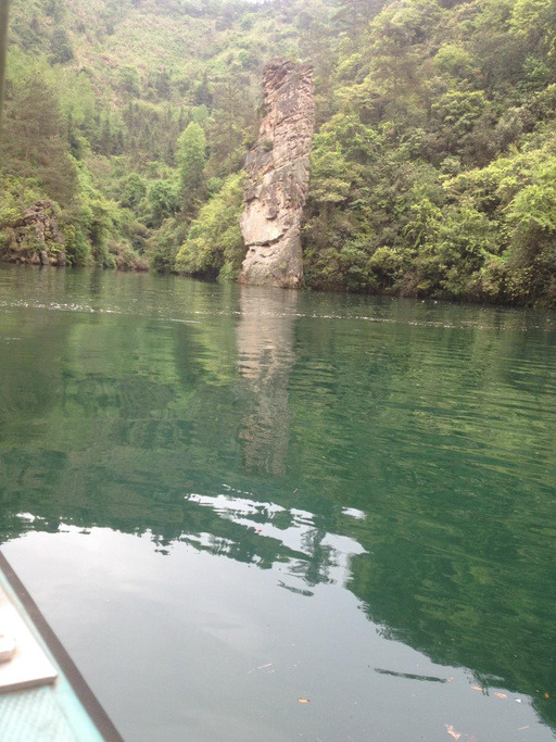 其实宝峰湖抱着平常心态去的,累的快不行了,既然来了不去又觉得不甘心,出租车师傅说不到2小时就能结束,想想反正就两小时,去吧!96门票/人,大老远就听到瀑布声,看惯了山看看水也不错。光看见瀑布走不过去,检票员愣是说往里面爬走,瀑布要从山那边绕过来,没想到这宝峰湖在山顶上,走吧,都麻木了,下午还挺安静的,一个人没有,走的我们感觉自己是不是走错了,上去才知道还可以坐船门票里含的,山顶蓝色的湖看着不大上船才发现挺宽的,只是被山峰挡住了,70多米深,阿妹阿哥还唱着山歌,湖中间有各种奇石,中间还有块高尔夫球“极限19洞”,很漂亮。船上的讲解不容易啊,20分钟,一刻不停,又唱又说的。下船后穿过峡谷到瀑布,瀑布旁边的水池里有只大鲵“笨笨”,130多岁了啊!