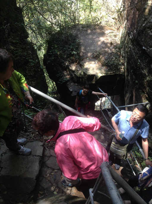 半个小时后到山顶(下索道坐了个电梯,其实还不如不上去,看一圈又下来,坐电梯得排队啊),排对的时候一阿姨出现了(热情啊,东北阿姨):“你们哪来的,去哪啊,我们8点上山没什么人,你们要去天门洞得这么走,大峡谷那地儿好,有段90度的楼梯,他吓的半天才缓过来(大爷翻了个白眼),还有段滑梯,很安全,那景色好啊,人还少,山山水水那才是天然的氧吧,门票也便宜90几块,你们真应该去那……”,我看着老张翻白眼,老张:“没事,咱们夏天去浙西大峡谷……”。