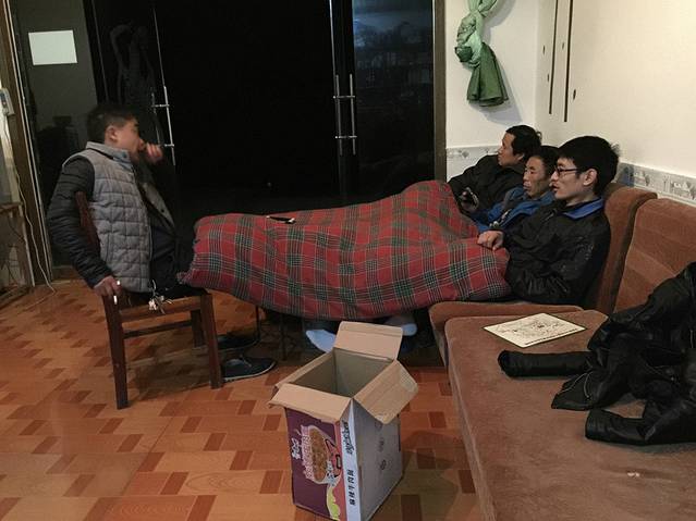 老张硬是要和人家老板挤一块烤火,下面是个炉子,山里面都用环保炭