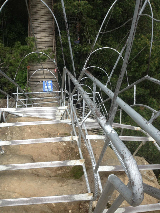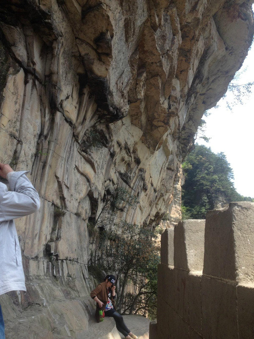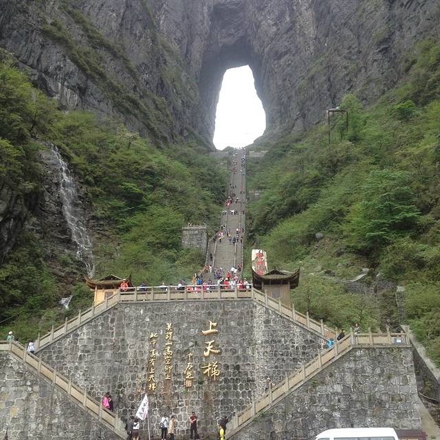 我们本来就冲这天门洞和玻璃栈道去的,就开始找了。听说西线的玻璃栈道整改迎五一,就改去找东线。张家界的通病什么路线什么乱七八糟的,摸索着走吧!玻璃栈道其实就是把原来的鬼谷栈道其中一段60米左右改成玻璃的,本来栈道建的挺险的,建个玻璃的确实不容易,对于恐高的是有点怕。沿着栈道走到天门寺,又迷糊了。去天门洞怎么走啊!问问吧。要么坐缆车要么沿着西线的栈道走。别人说西线挺好走的,我决定还是走一趟吧!幸亏走一趟,比坐缆车,西线的鬼谷栈道还是值得一走的,个别观景台确实吓人。到头问一下,原来天门洞还得坐索道下去,然后再坐观光车上去??好吧,排吧!相比张家界走的,天门山一直在排队。折腾一番终于上了天门洞,望着那长长的楼梯,算了吧看看下去吧,晚上还赶火车呢。