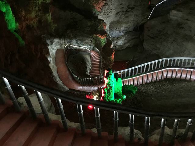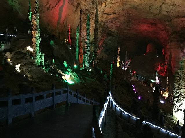 宝峰湖如果大家时间充裕还是可以过去看看的,结束宝峰湖都快5点,我跟老张就犹豫了,去哪里?这边还有黄龙洞、大峡谷没看,住这边明天就没时间去天门山了!想想舍弃了大峡谷,今天去黄龙洞,晚上去张家界市区(去张家界市区的车一直到晚上8:30票价好像12元),第二天去天门山(谁让我一直想去坐那边的索道和走走玻璃栈道呢,老天,如果再有一次机会我还是去大峡谷吧,老张说我作的不去天门山也会后悔)时间好赶啊!从宝峰湖去黄龙洞打的30车程20分钟不到(师傅一直说这时候还不如去大峡谷……汗),门票100块,晚上八点多才停止入内,可能那边本来就是洞不需要太阳本来就有灯。去的时候正好有两个团过去,好多人,全程靠走的,上楼梯下楼梯,神啊!讲解说:里面没信号你们跟好了,丢了找不到。……黄龙洞里面是一个很大的溶洞,洞中有洞,洞中有河,各种石笋、石柱,打着灯,