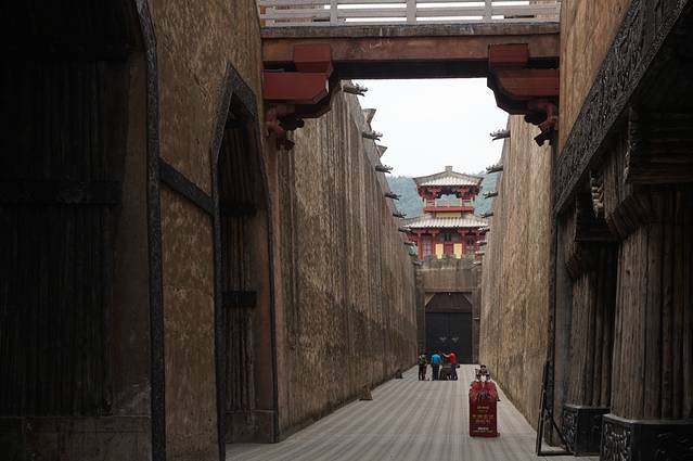 横店诞生大片最多的地方,莫过于秦王宫。秦王宫拍摄基地是1997年横店影视城为配合电影导演陈凯歌完成世纪之作《荆轲刺秦王》而搭建的,同时也是巨片《英雄》的诞生地。景区占地面积800亩,建筑面积达11万平方米,造型恢宏大气,秦汉风格浓郁。有雄伟壮观的王宫宝殿27座,主宫“四海归一殿” 高达44.8米,面积17169平方米。长2289米,高18米的巍巍城墙与王宫大殿交相辉映,淋漓尽致地表现出秦始皇并吞六国,一统天下的磅礴气势。还有一条长 120米,占地面积20亩,建筑面积6000平方米的“秦汉街”,充分展示了秦汉时期的街肆风貌。黄尘古道,金戈铁马,燕赵建筑,秦汉文化,在秦王宫得以真实再现。