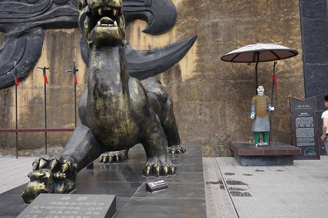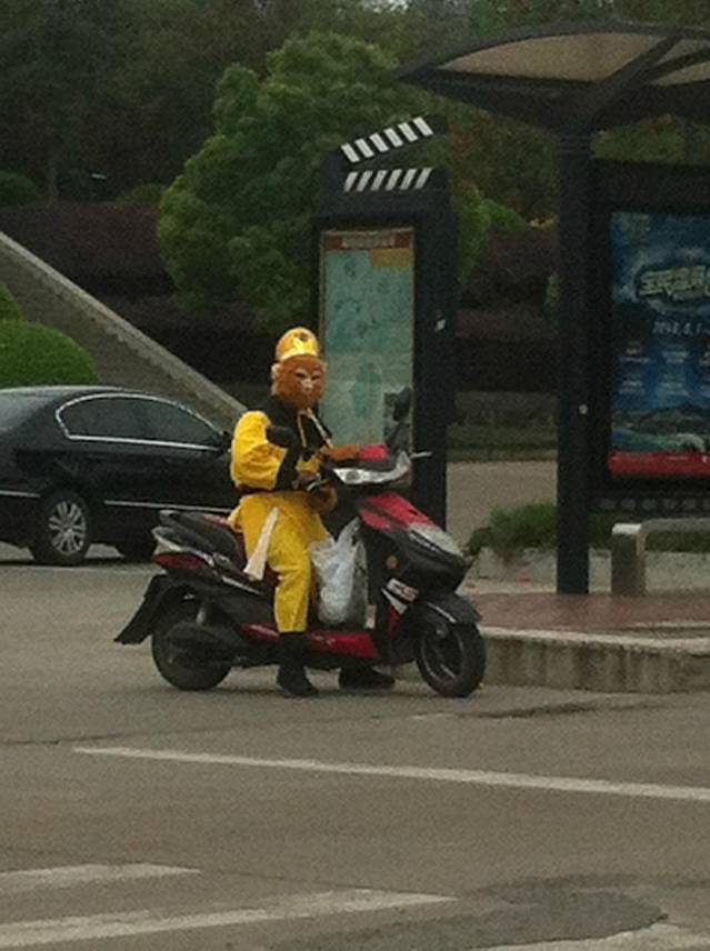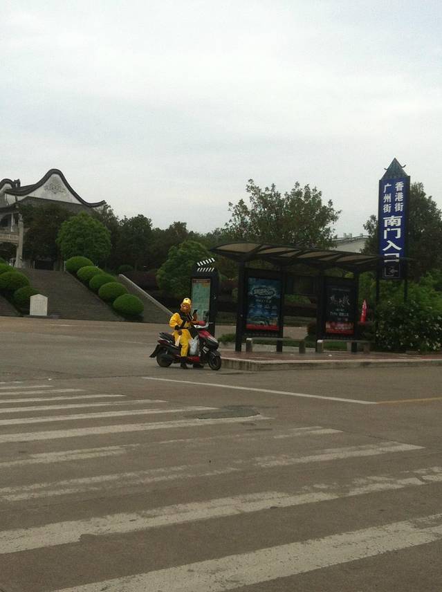 在想这个是拍戏的吗可这状画的太不像了呀开骑得电动车随便跑,后来又看到一个关公打扮的人后才知道在横店镇上这样穿着打扮的有人很多一般是送外卖或拉送客人的,为了吸引游客也为了某一天被那个好心导演能看上吧!