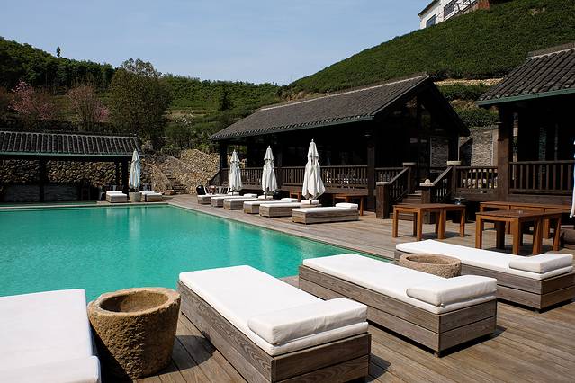 万株玫瑰花园拥簇着恒温山泉泳池,待到花开时节,畅游一番,躺在花香中听山风吹过竹林的声音,想想也真是醉了。酒店本身是新的,而所有的瓦片,都来自当地的老房子,这些老的瓦片,让房子散发出古朴的气韵,这些细节,除了环保,更是对当地传统的尊重。
