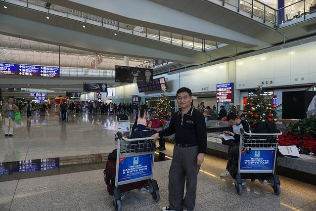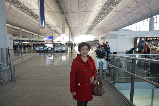 飞机是晚上20点05起飞。我们在家吃完午饭,不慌不忙地乘小巴到福田口岸出关。出关后下楼在公交站乘B1路双层巴士去元朗(每人11港元),在元朗“又新街”站下车,过马路,在马路对过的B1车站转乘E34B双层巴士(B1与E34B同一个站台)去机场(每人13.9港元)。这个线路去香港机场,比乘地铁还便宜许多,而且途经青马大桥,风景也很好。