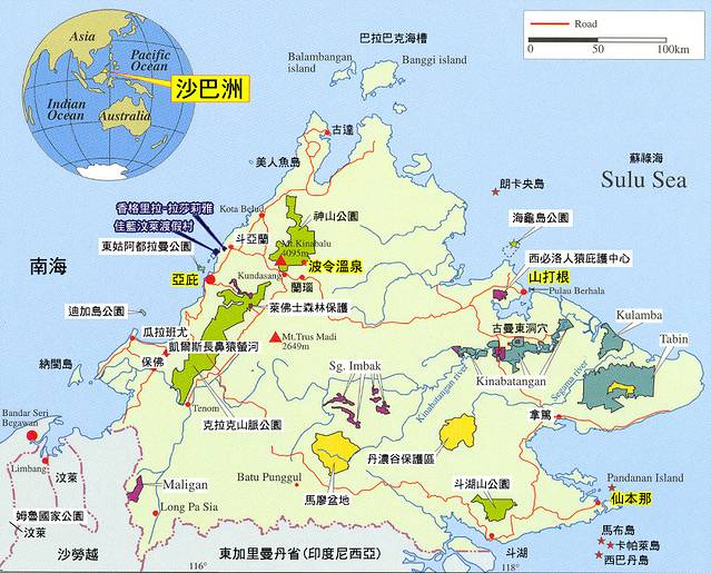 沙巴州地图及在地球上的位置。