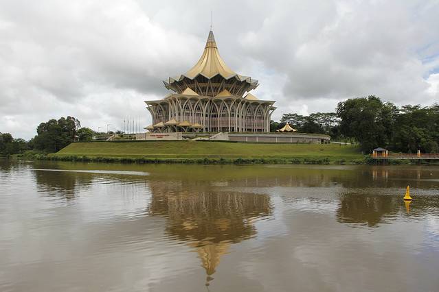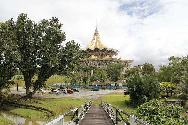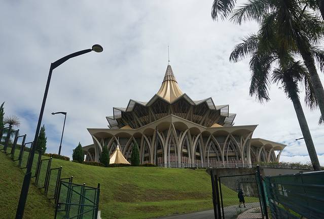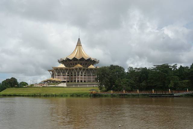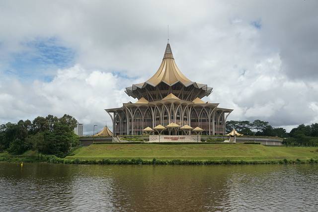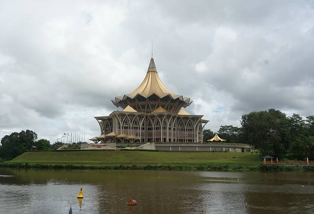 金碧辉煌的沙捞越州议会大厦,坐落在沙捞越河北岸,是古晋的新地标。屋顶为九角形的特色建筑风格寓意着猫的九条命,象征着好运的到来,充分体现了古晋人民对猫的喜爱之情。