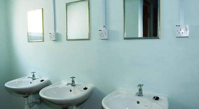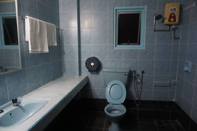 卫生间够大,只是地漏是堵塞的,淋浴的水下不去,搞得涨水……