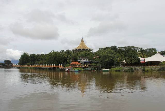 沙捞越河。远处的尖顶房子就是沙捞越州议会大厦