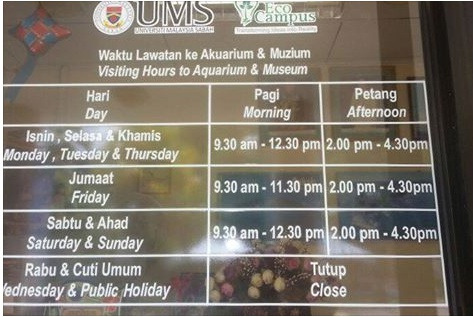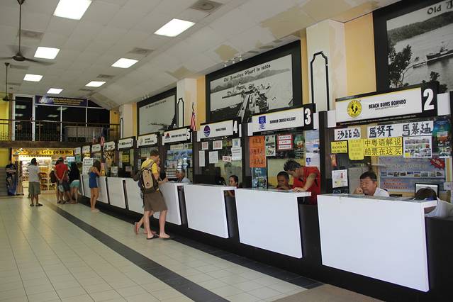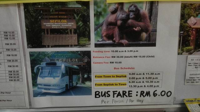山打根背包客旅馆的前台贴有一张西必洛人猿庇护中心游览图解,上面标注了山打根前往西必洛的大巴班车时间(上午9∶00 & 11∶30;下午2∶00 & 5∶00;共4趟班车,每人票价6元马币),以及人猿中心喂食的时间(上午10点,下午3点)。