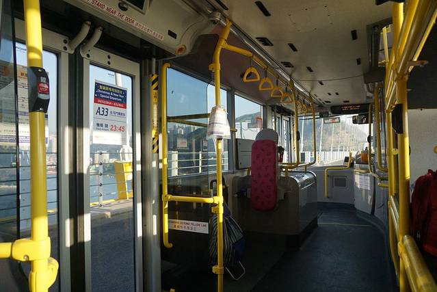 E34B双层巴士内部,乘客很少,舒适度也比地铁高。右侧是大件行李区。