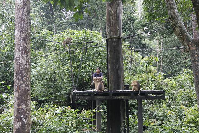 沿栈桥大约走了10分钟,便来到了人猿喂食处。喂食的饲养员还没离开……