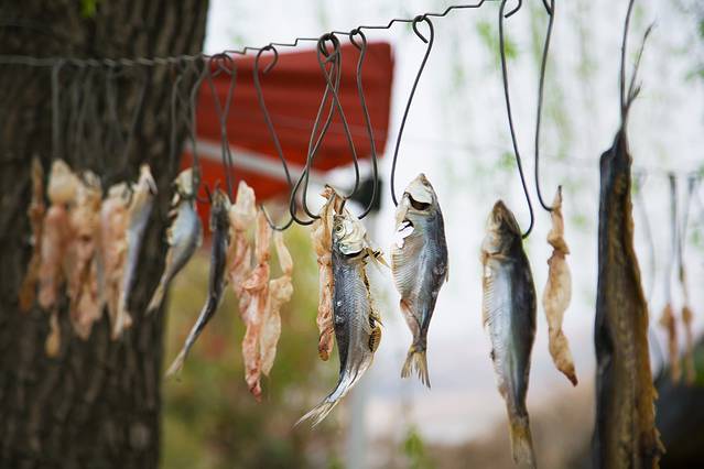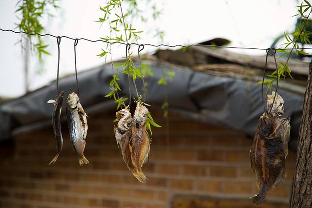这里的鱼干都是自己在湖里钓上来晾晒风干的,其他许多农家菜品也都是自给自足。