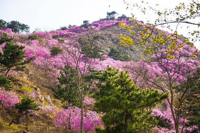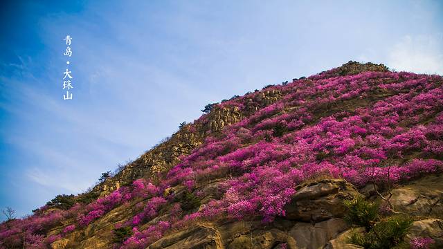 青岛大珠山,四季长青,三季有花。位于青岛西海岸黄岛区,与青岛城区隔胶州湾相望,有“岸海名山”之称,与小珠山构成“双珠嵌云”之胜景。素以“谷秀、峰奇、树茂、花繁、石怪、水清”而著称,每年早春杜鹃花便会迎春绽放,一直持续到五一后。杜鹃盛开时,如红云翻滚,漫山遍野,飞霞流丹,十分壮观。大珠山也因此被称为“春来飞红第一山”。