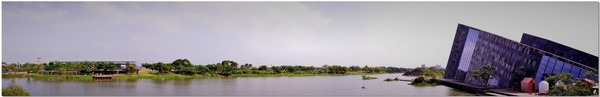 建筑尖端指向龟山岛,左侧凸出的小空间是三楼透光室,可眺望湿地