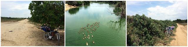渡海后经新港村之后沿海就是一段长长的沙土路,这段路把我折腾废了,期间只有一户养鸭子的人家,门口几条大狗守着,想要水也不敢靠近…这段路是出发以来最难走的,虽然不时有到海边的便道,但是真的被折磨的没兴趣了,一路上没人,没水!