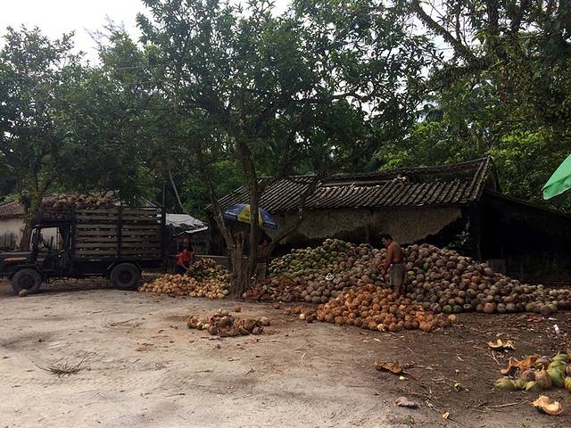 拐入乡道发现专门剥椰子皮的工人
