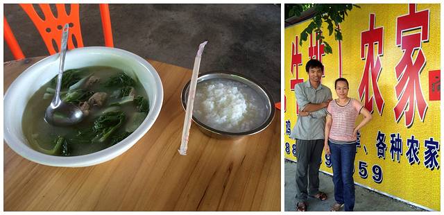 走乡道,去一户人家要水,大姐给我打完水带我去吃饭,还切大肉给我吃,不过大姐说自己不会普通话,也听不大懂,所以也没办法聊天…一小盆稀饭被我喝完了,大肉太咸只吃了两块!两天来第一次吃那么饱,无以为报,拿出四颗糖给家里的小孩,跟大姐合影留念,谢谢纯朴善良的人!