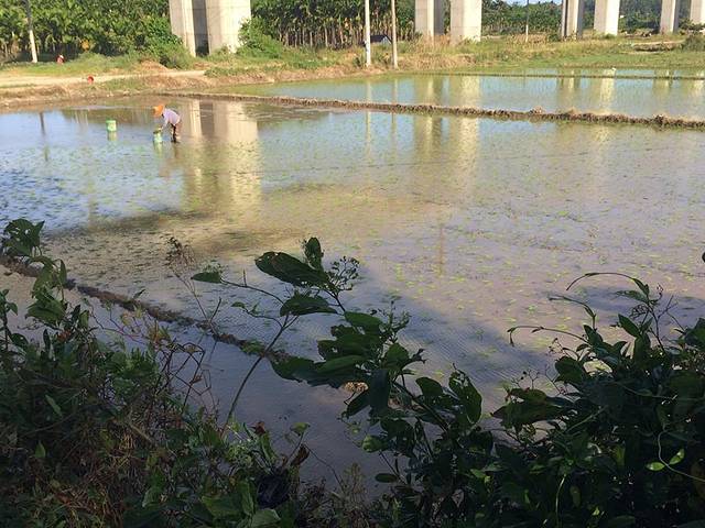 看到正在插秧,确切说他们在丢水稻苗