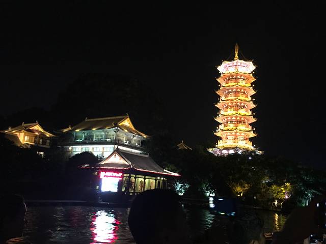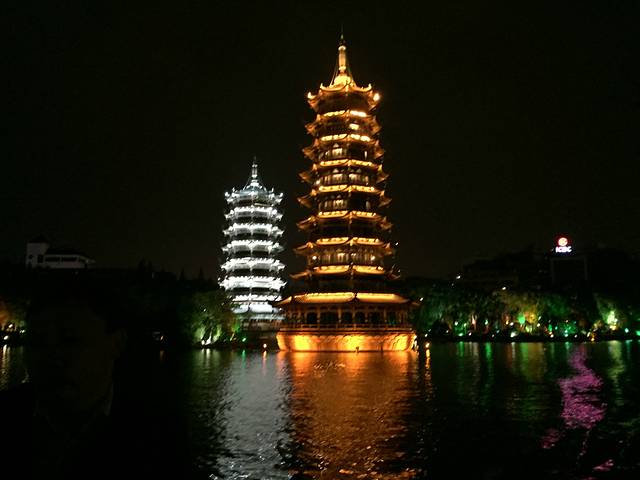 夜游两江四湖是桂林一大卖点 修建的很好 还有表演 五一的时候比较贵 建议大家这个尽量不要错过 会经过双塔 而且夜晚的双塔也确实很漂亮 我是在文昌桥登船的 所以要在解放桥下船 豪华船大一些 二楼是露天观景处 硬座和普通的小些 我在五一期间定的硬座是160 平时应该会便宜些 大家可以斟酌着选择