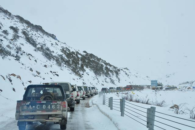 翻越色季拉山口的车辆因为下雪排起了长龙,全都是亦步亦趋,小心谨慎,这可不是闹着玩的…………