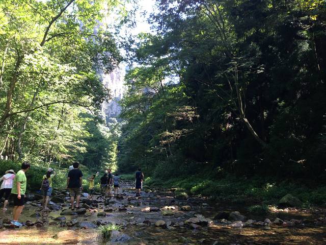 猛洞河漂流以其漂流长度和水流湍急闻名,第一次玩漂流,还是很激动的~上午坐导游的车到达以后,显示在门口换好防水衣(租的),不然可就要湿身了,还可以租水枪~打水仗可是漂流过程中必不可少的~坐的气垫船大约可以容纳十多个人,每条船上配备一名船夫,负责划船~刚开始一段水流不急,船夫划得比较慢,给我们时间让我们和其他船上的人打打水仗~中间有一段水流挺急的,有漩涡,也很刺激~仰望两岸的风景真是一种享受,有个地方还有一个小瀑布,船夫特意从瀑布下面传过去~后半段水流不急了,也不让打水仗了,有点无聊。到终点,看到有些人在游泳~