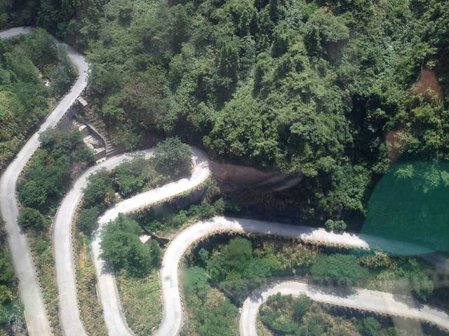 坐在缆车上能看到下面的盘山公路~