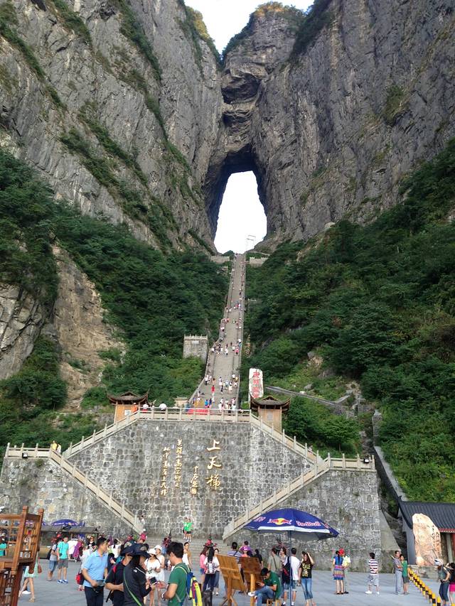 最后一个景点也是最吓人的一个就是这个赫赫有名的洞了,是天门山也是张家界的标志,晚上的时候会亮灯,使得在远处也可以看到,我们在张家界机场的时候就看到了,一个洞悬在空中~