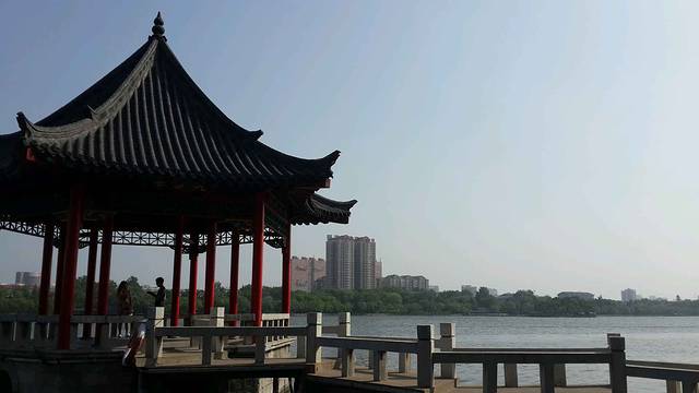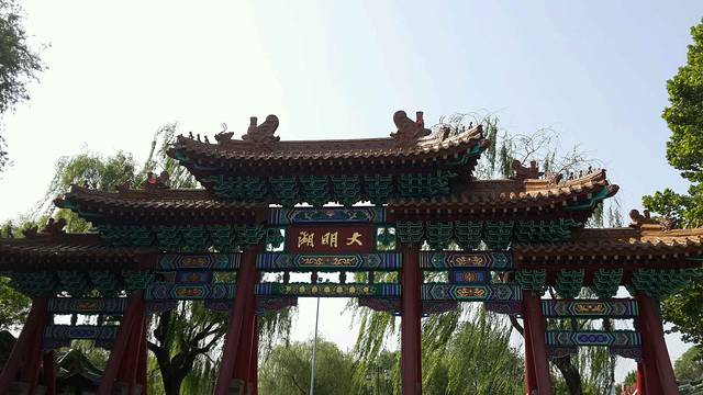 公交车真的很慢很慢,感觉是摇摇晃晃就过去了。到大明湖是六七个站,并不远。下车后马路对面就是大明湖景区,可以直接看到正门的入口,但是从那里进去需要买票。在正门的右边有一排圆形石墩,往那里走下去就是沿着大明湖的一条道路,一路走就可以尽览大明湖的景色,如果不是为了坐坐船,完全没有必要买票进去。看惯了杭州西湖,也欣赏过扬州瘦西湖,觉得大明湖的景色一般般,可能是还没有成片的荷花应景吧。游览时间两个小时就够了,到后面看到的风景都是一样的。
