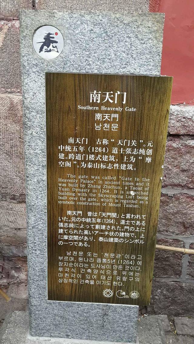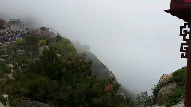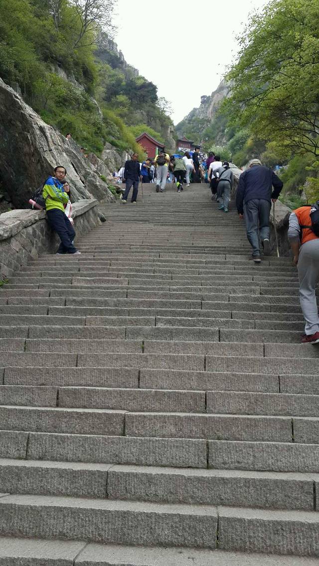 下车后就开始徒步登山。和黄山相比,泰山显得有点单调,一条道上去,很宽敞,挺好爬的,适合带父母来的那种。我们以一般的速度登山,中天门到南天门大概两个多小时。中天门到南天门也可以坐索道上去,但是要100多一个人,略贵了。
