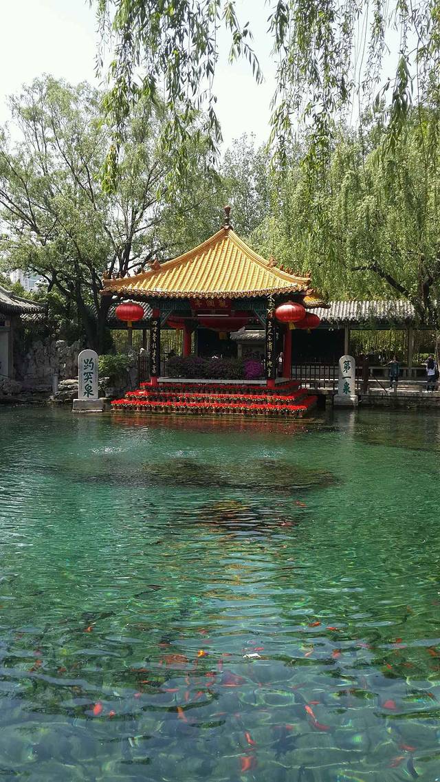 从芙蓉街正门出来,往右边一直走,看到很多绿色一片有树的地方就是趵突泉景区了。我从北门进去,学生票20块。来济南就是为了看看趵突泉,泉水真的很清很漂亮,翡翠色非常迷人。还可以自己带个空瓶子去接一瓶泉水回家,杜康泉有专门的接泉水的台子。景区不大,两个小时就能逛完了。