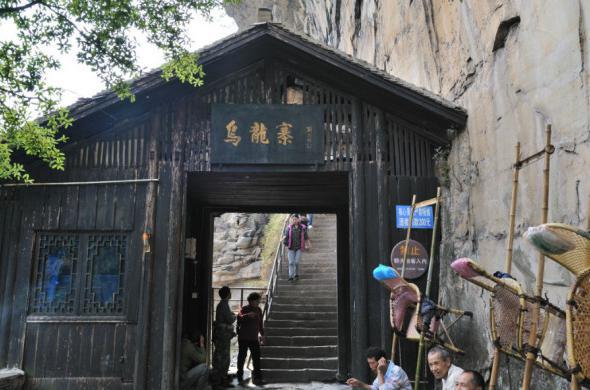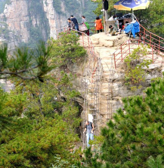 在旧社会时期,都说湘西盛产土匪。而这里也不列外,这里还真的就是一个很有名的土匪窝了。说起这个地方,还有个很真实的故事呢:那是在北宋时期,当时土匪横行,在杨家界这里凭借着地势的天险,占山为王。而当时杨家将也效忠于朝廷,所以就派他们家族的人去那里缴匪,最终缴匪胜利后。因他们的后裔在那一带繁衍生息,有姓杨氏的人而得名为杨家界的。而那个乌龙寨也确实是因为《乌龙山缴匪记》这部影片在此取过很多的景,因她的播出而使得这里名声大震。爬山的途中,要经过三道鬼门关(一步难行、谁敢不低头、一线天或者叫瘦身谷)加一道哨卡,才能够登上山顶。看到杨家界的一处绝景----天波府(四道天然形成的石墙依次平行排列,还真的就像是当初杨家将缴匪的时候摆下的龙门阵,十分壮观。)等你欣赏好这山顶上的景色之后,你会发现,只要是想上这座山顶,除了刚刚爬上山的那条道,再也找不出第二条了。然而,当你站在这里的群山之颠上,你是不是要不尽叹息到:当年别人做土匪也不容易啊!所谓万事开头难,只要肯登攀!这句话应该没错吧!呵呵``````别忘记只顾着抒发感情了,当心你的脚下哦!返回到乌龙寨餐馆那儿之后,再从另一条道徒步而上,还可以游览到五郎拜佛、一步登天(杨家界的至高点,近可以看见杨家界,袁家界的全景,远还可以看见黄石寨、腰子寨。甚是壮观!真的是一步可登天!)、登过天之后,要记得安全的下来再沿着一条紧贴悬崖旁边的羊肠小道而上,在不远处就有一个高空的观景台----空中走廊,此时的徐徐凉风让人有种清雅脱俗的感觉,广阔的视野,层层的梯田,还有那站在山凹中间的“不倒翁”。大自然带给你的那种粗犷的感觉犹如身在仙境一般,如痴如醉!
