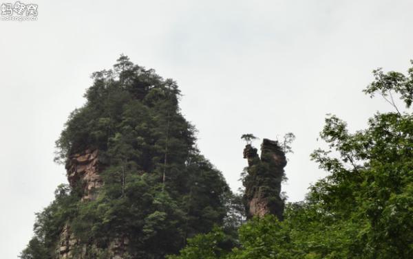 此时此刻正在干嘛吗?不要想成他正在帮师傅探路、或是帮师傅化斋哦!他正在和他的媳妇儿打情骂俏呢,你们看他的媳妇是多么的娇气啊,被背在背上不算,她还怕张家界的太阳晒伤她,竟然打了一把小洋伞呢!走到这里还有最后一个很感人的母子峰----一个形似他的石峰,在她的怀中还有一座小的石峰。很像妈妈在抱着一个小孩一样,特别形象!走到这里,金鞭溪的前半程您也就走完了。而金鞭溪的后半程,景点虽然是很少。唯独在终点处的水绕四门了,站在这里。你可以感受到群峰将这里围成了一个四四方方的空间。在每一个角落里都像是开了一扇门一样的,其实这里是因为有三条溪水汇合于此,在这里形成了一个小沙洲。从而形成了很像四扇门的感觉,因而得名水绕四门的。到了这里,金鞭溪也就结束了!