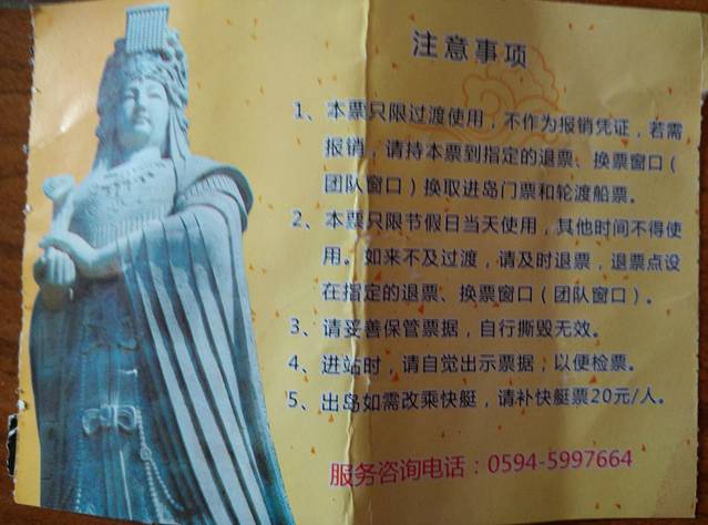 从石狮坐大巴40元,到当地车站后,可以乘坐362公交到文甲码头,但是五一当天,人太多,所以打的,30元一人,到达码头,登岛费65,来回船票20,总共85,教师证等证件可以打折哦,打折完5
