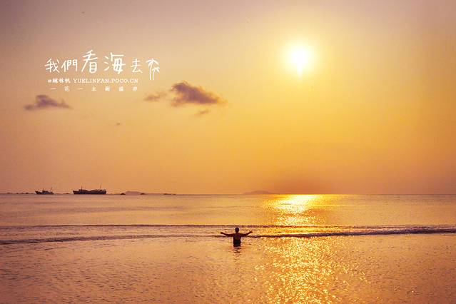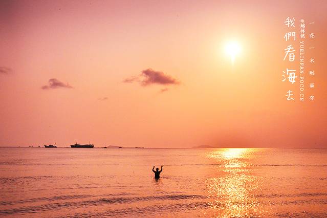 ▲一位阿姨走到海中间拥抱落日,恰巧海浪袭来,颇有“天地为我开”的气势~