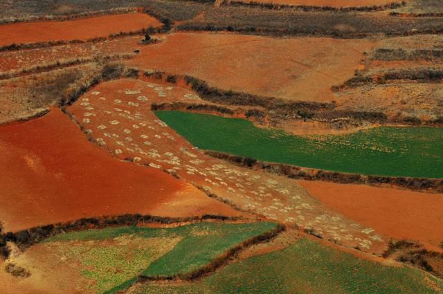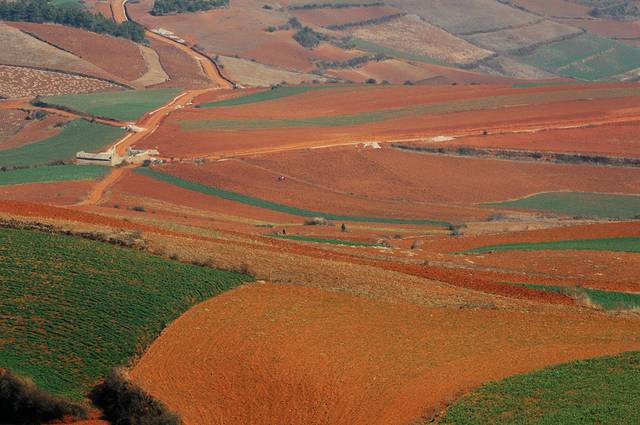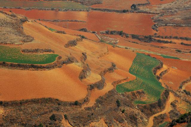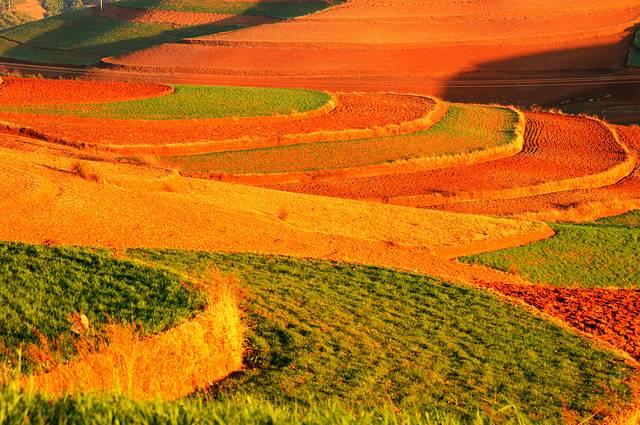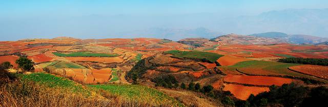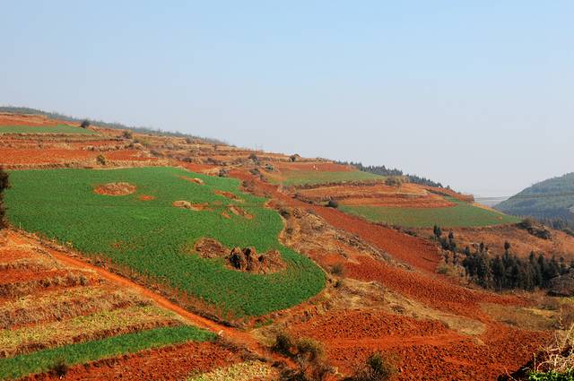 东川红土地属于昆明市东川区管辖下的新田乡花石头村。从昆明到达景点中心行程约250公里的路程。由于云南地处温暖湿润的环境,土壤里的铁质经过氧化慢慢沉积下来,逐渐形成红色的土质。实际上红土地是一种低产的贫瘠的土壤,在不同的季节,随着红土地上耕作的农作物不同,红土地也呈现出不同的色彩。