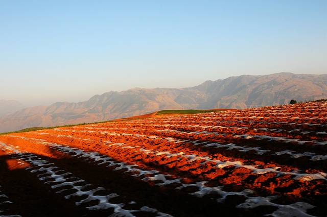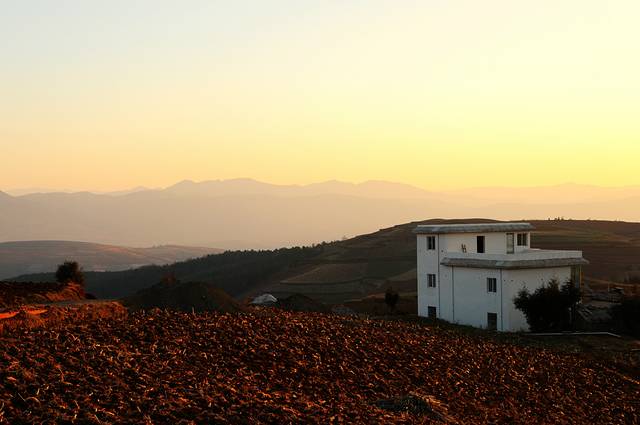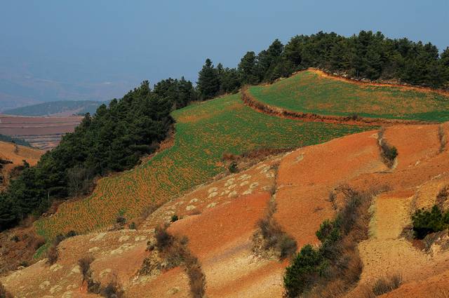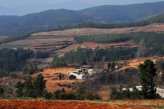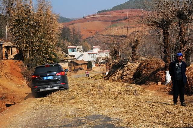 东川红土地的主要景观呈Y字形分布,Y字形的左侧向上有七彩坡、锦绣园、打马坎,锦绣园和七彩坡都可以走进去,看到不一样的风景。Y字形的右侧分叉上有千年龙树,落霞沟,月亮田等。直着下来的一竖有螺丝湾、乐普凹、锅底塘等景点。东川红土地的主要景点在海拔1800至2600之间。我们去过川北甘南青海湖,这个海拔实在不算什么。 在家庭旅店安排好了以后,2:00左右我们开车出去随便逛,现在景区不收费,只是在道路分叉的地方有一个登记站,做一下车辆登记。我们先去了七彩坡。实际上,红土地的每个景点距离并不远,尤其是开车,随便晃晃就到了。只是道路不宽,又很弯曲,现在是淡季,没什么车,到了旺季可能会有些麻烦。