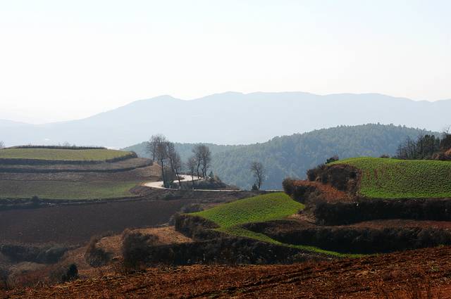 逛到12:00,我们开始往回走。中间走走停停,遇到好的风景就拍一阵。在车辆登记处,也就是大约Y字的分叉处,有一处景色十分好,有梯田有树还散落着几间小房子,光线也不错。冬天的红土地,以红黄两色为主,间或有些绿色,如果光线好的话也挺艳丽的。