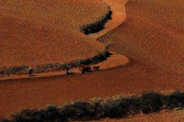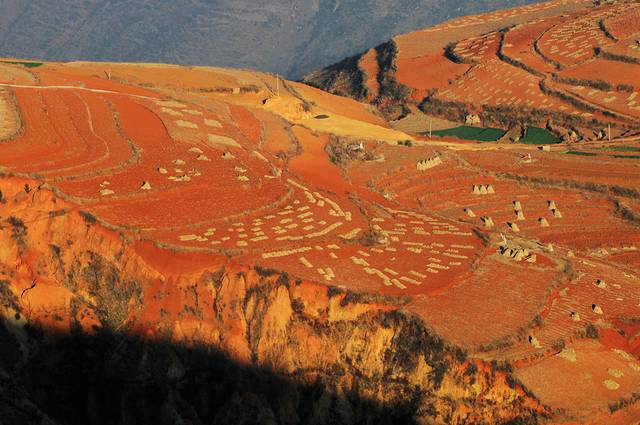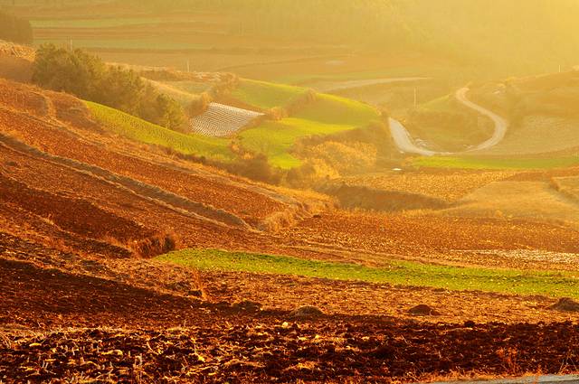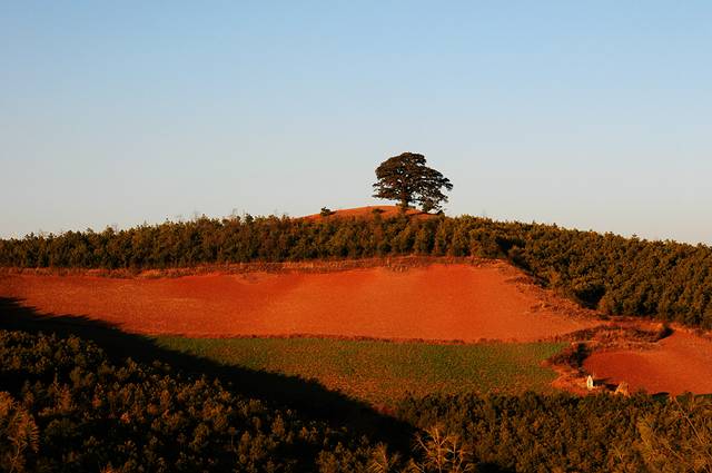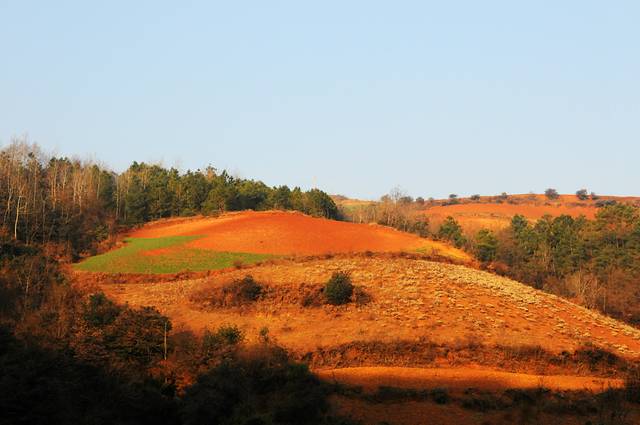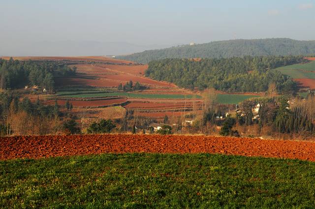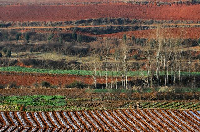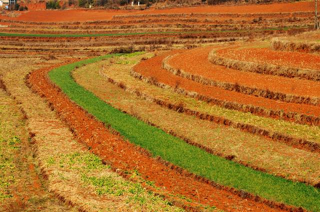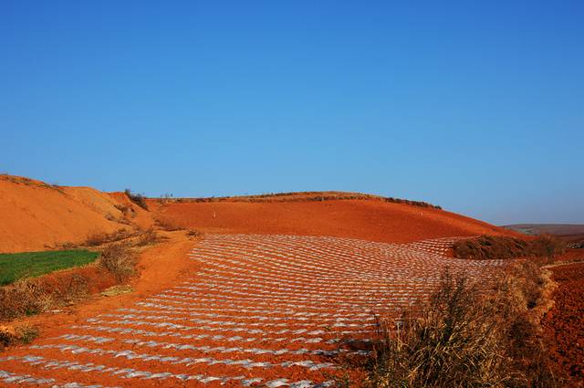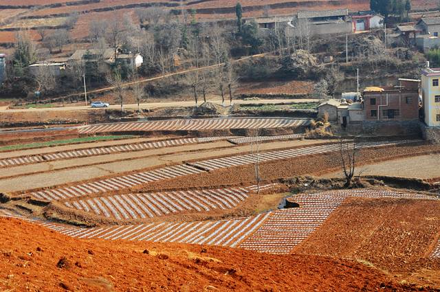 虽然在网上看过很多红土地的图片,虽然现在并不是最好的时节,看到红土地,仍然会觉得震撼。这里的风景真是不错,虽然是冬季,大多数土地处于休耕时期,有一些土地仍种着绿油油的庄稼。土地的颜色也不一样,有的浓一些,有的淡一些偏黄色。收割过的田地仍有成跺的庄稼堆在田地里,看着十分整齐。红色的土地上点缀着些枯黄的色彩,也十分好看。