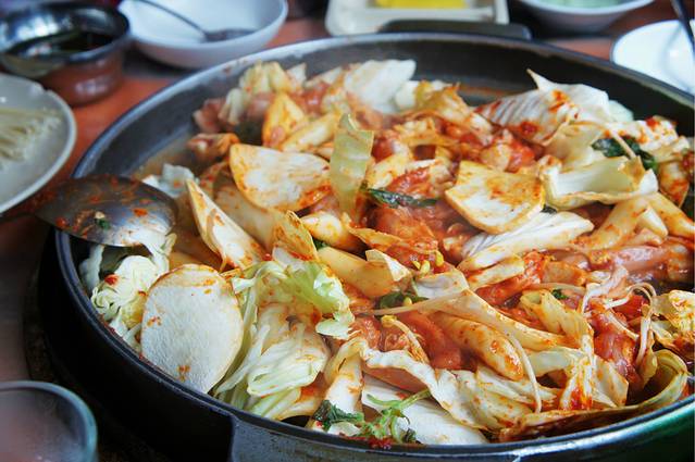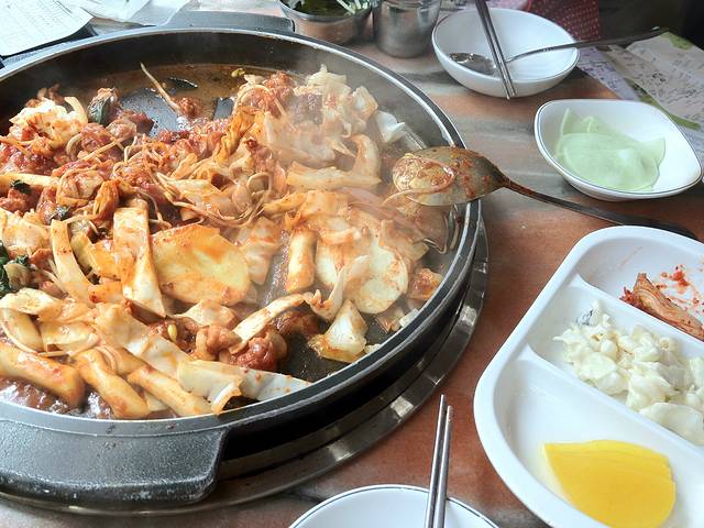 辣炒鸡配上火腿、白菜、面条、年糕、最后淋上浓浓芝士,连我这种太不能吃辣的人都欲罢不能!