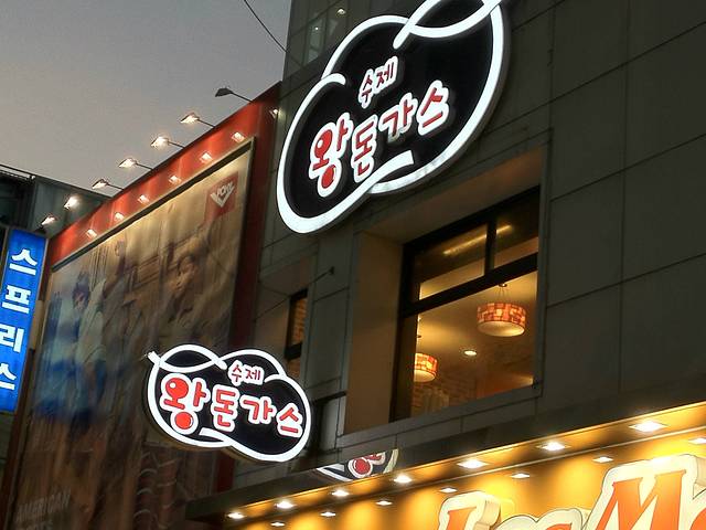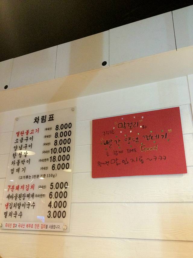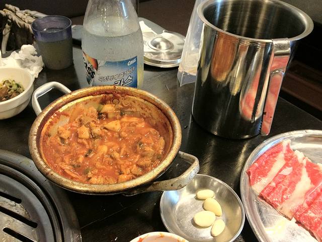这是一位在韩国留学的朋友极力推荐的烤肉店。 我去的这家在弘大附近、明洞也有分店。 烤肉味道很适合中国人口味,篇甜,正中我下怀。小菜可以尝试泡菜小锅,非常入味。 (原谅一个懒人饿着肚子用手机拍而造成图片
