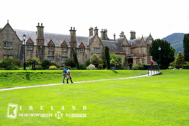 从停车场步行几分钟即可看到莫克洛斯别墅(Muckross House),若想进入城堡别墅内参观,则需要购买门票,而城堡外的一切美景全部免费。城堡并不算大,但位在基拉尼湖畔,门前是一整片辽阔绿坪草地,宁静雅致。时不时有一辆贵族小马车缓缓沿湖岸驶过,这种被叫做Jaunting car的小马车是爱尔兰传统的交通工具,在十八十九世纪,只有贵族和有钱人才能享用,如今已成为爱尔兰一旅游体验项目。