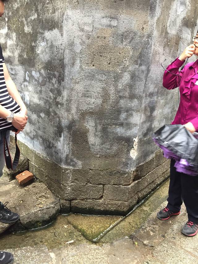 这处墙角被摸成了一个平平的斜面,但是下方的地基依然存在,到了上面也依旧是直角。主人为了方便邻居们在巷子里抬轿过往而把这个角让了出来,导游说这个所谓的拐弯磨脚体现了主人做人的宗旨是“不让天、不让地、中间让的是和气”地下的地基一定要有,这是老祖宗留下的地。