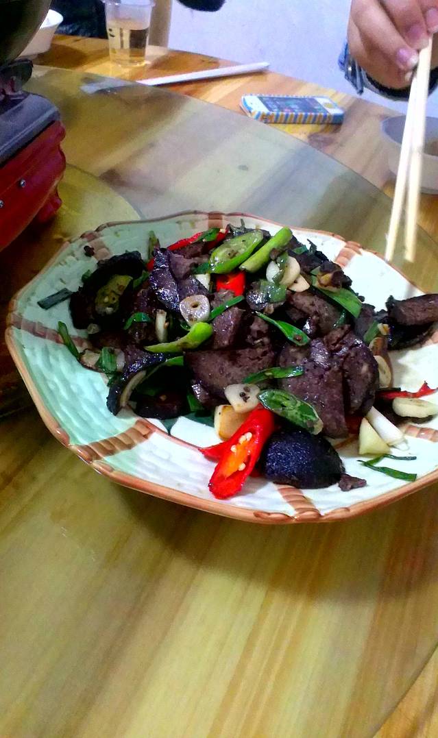 血豆腐,泡在鸭血里面的豆腐干再进行烟熏,感觉太油,吃一点试试倒是还可以,但是吃多就不行了,广东人口味没办法,后来真的是受不了这些重口味的食物,我们只能在附近找清淡一点的,终于在汽车站二楼发现了肠粉和小米粥,舍长那两眼发光的样子,甚是可爱……