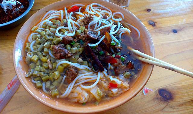 大杂烩米粉,当地特色,有黄牛肉,野生木耳,腊肉,野鸡肉等在一起,挺好吃的,15元一碗,可以单点一样肉便宜点8元一碗。决定土豪一点来碗全部都有的。